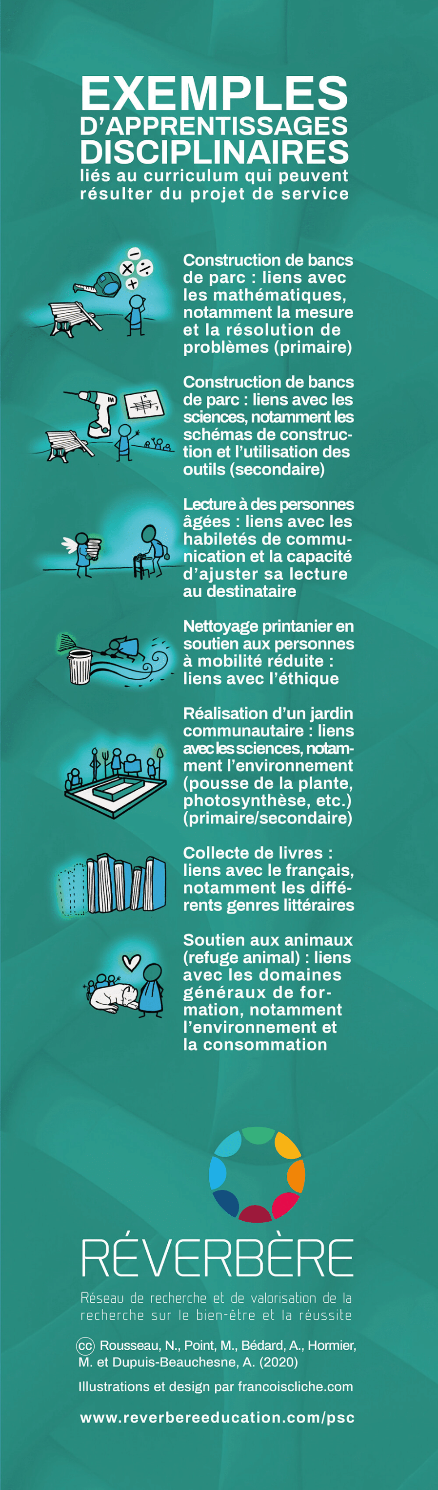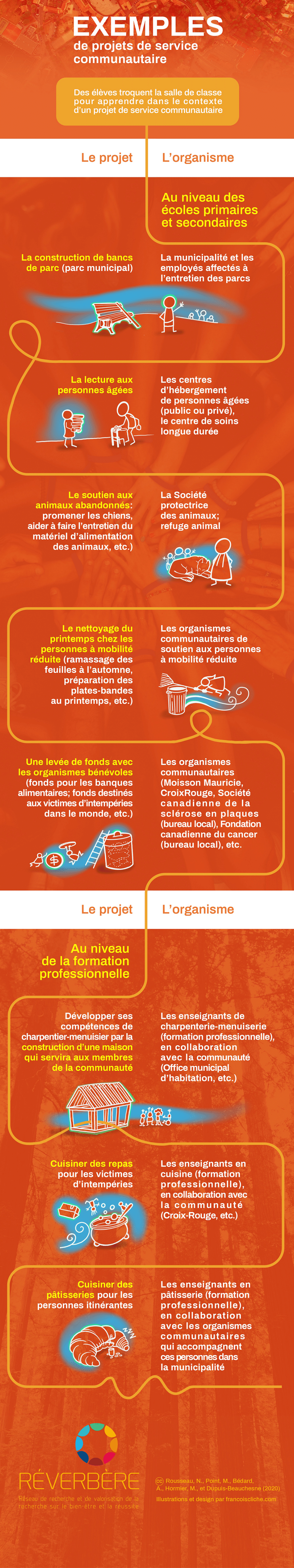 Ici vous trouverez quelques exemples de projets de service communautaire, qui pourront vous être utiles tant pour vous inspirer à en réaliser un que pour soutenir votre compréhension de ce type de projets