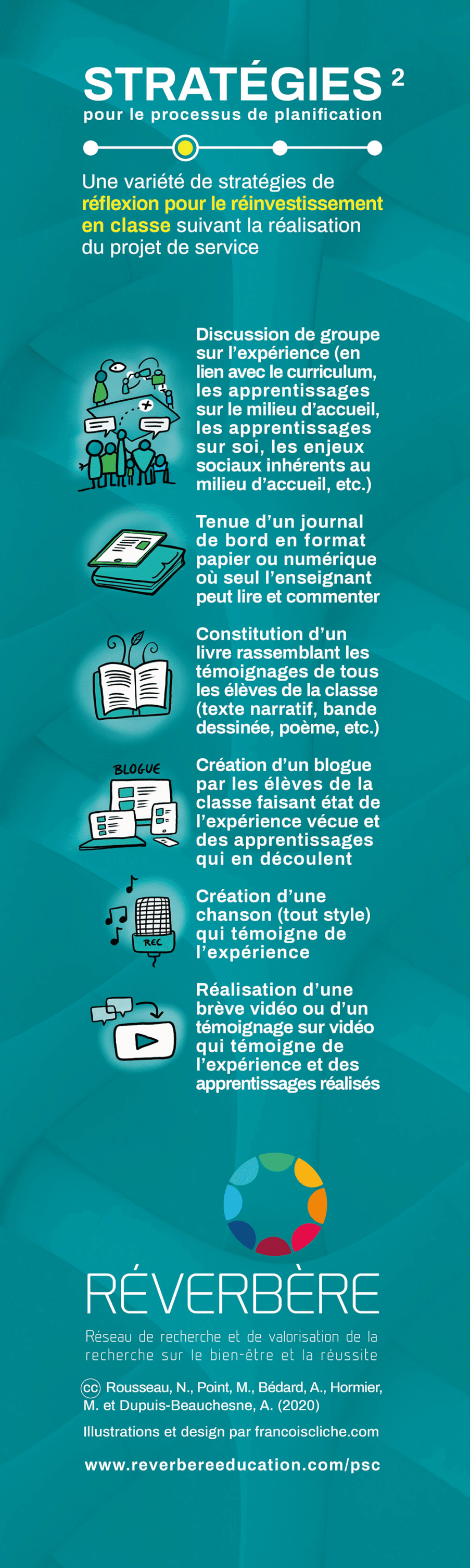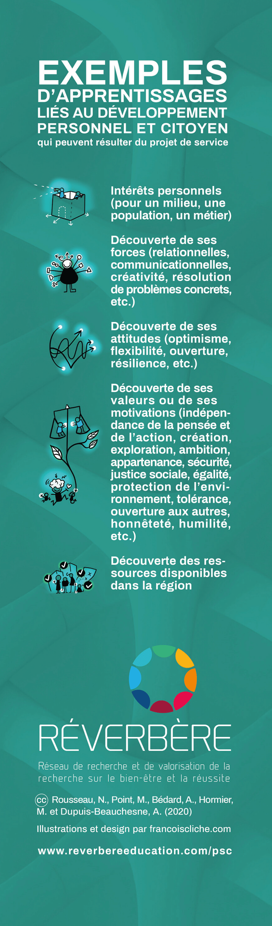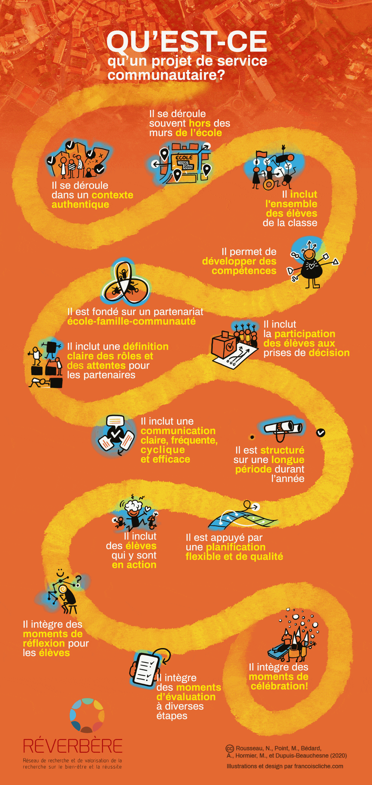Sur cette page, vous trouverez de l'information présentée entre autres sous forme d'affiches, de questionnaires et de documents téléchargeables qui vous aidera à mener à terme un projet de service communautaire avec vos élèves, de la pré-planification jusqu'à l'évaluation et au partage, en passant par la planification et la mise en action.
