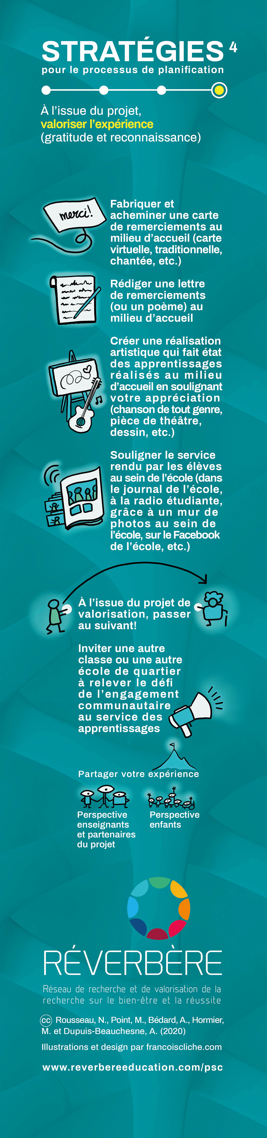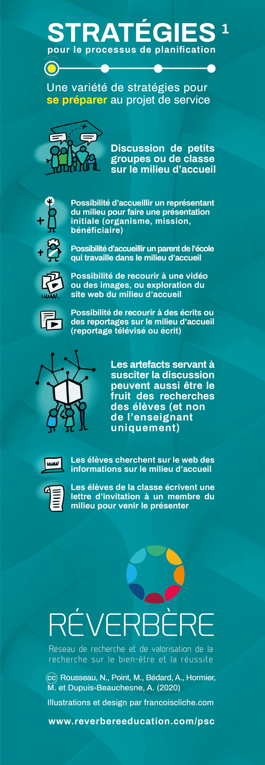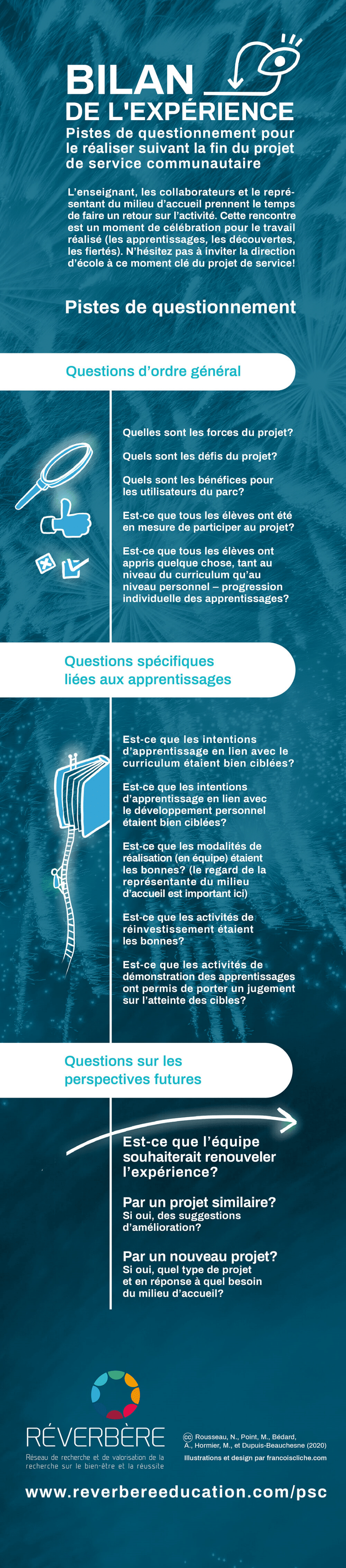 Sur cette page, vous trouverez de l'information présentée entre autres sous forme d'affiches, de questionnaires et de documents téléchargeables qui vous aidera à mener à terme un projet de service communautaire avec vos élèves, de la pré-planification jusqu'à l'évaluation et au partage, en passant par la planification et la mise en action.