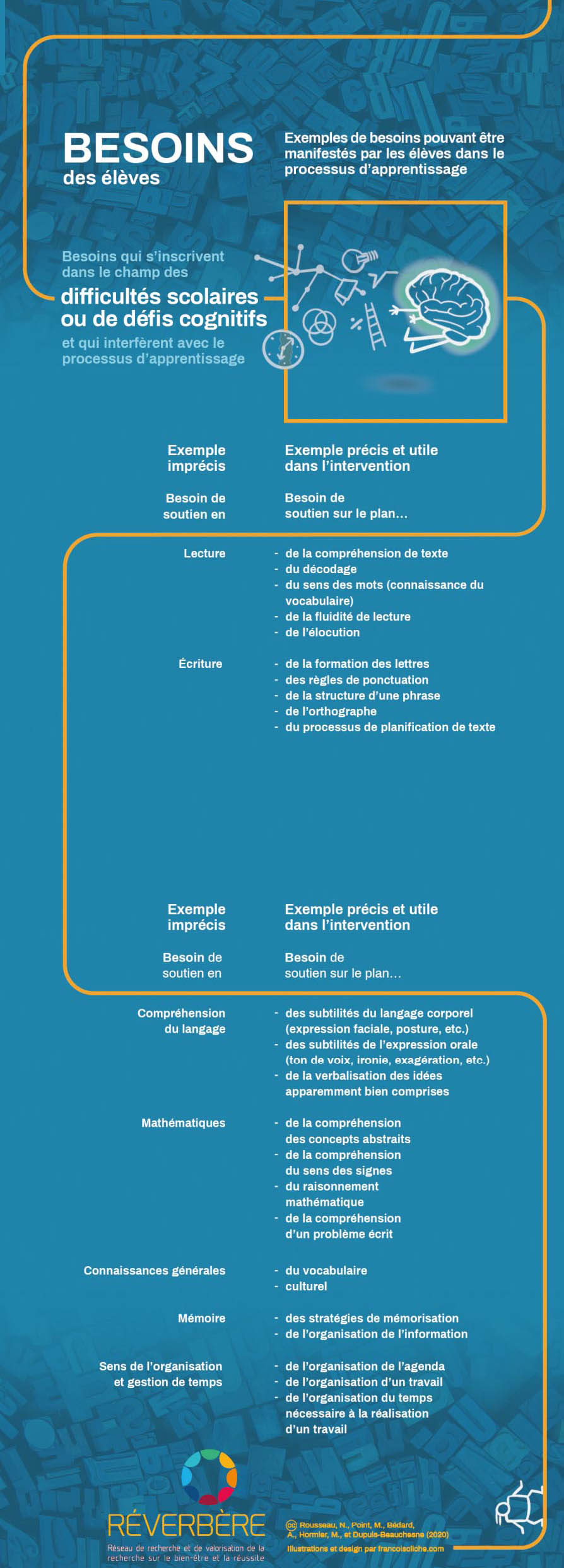 Besoins qui s'inscrivent dans le champ des difficultés scolaires ou de défis cognitifs et qui interfèrent avec le processus d'apprentissage