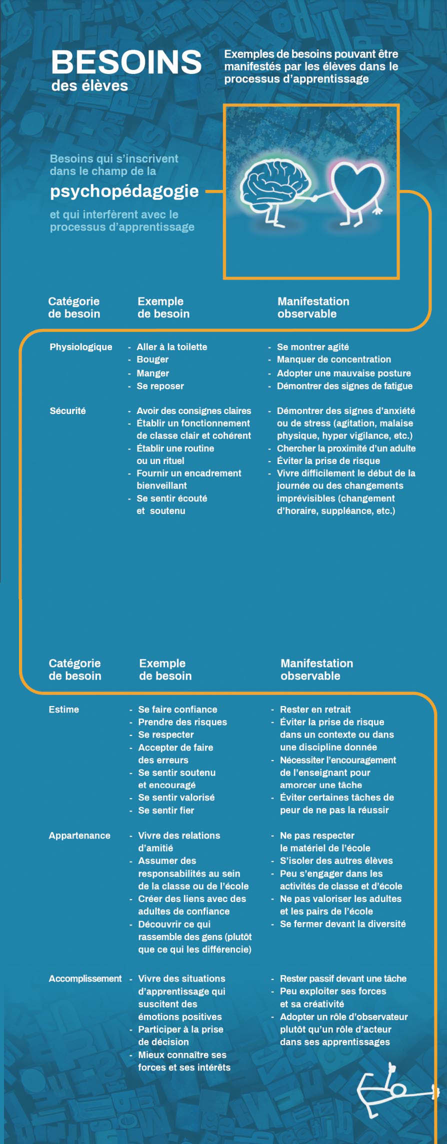 Exemples de besoins pouvant être manifestés par les élèves dans le processus d'apprentissage.