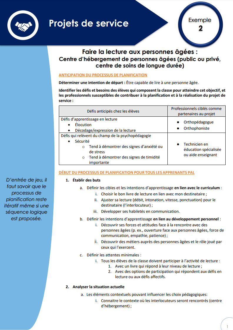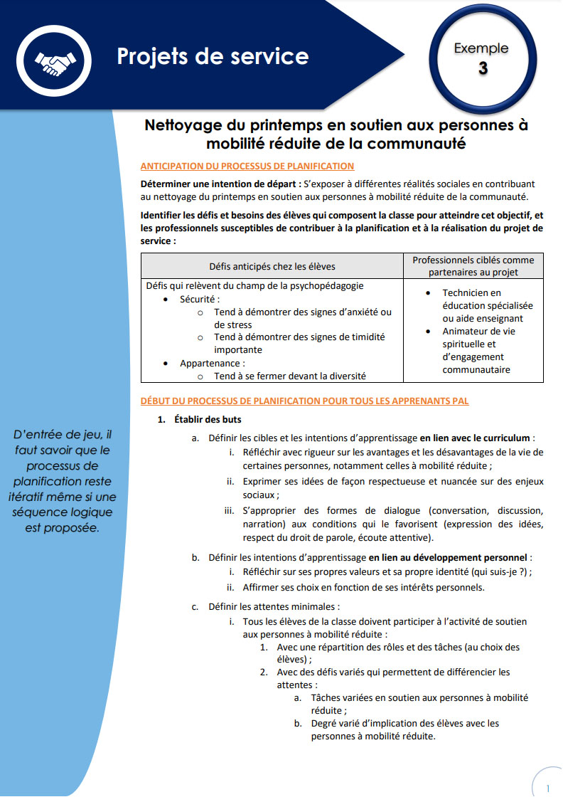 Vous avez maintenant toutes les informations nécessaires pour poursuivre votre planification! Pour vous aider, nous vous proposons deux cartes d'explicitation présentant des exemples d'intentions typiques de projet de service, soit les intentions pédagogiques liées au curriculum et les intentions liées au développement personnel et citoyen des élèves.